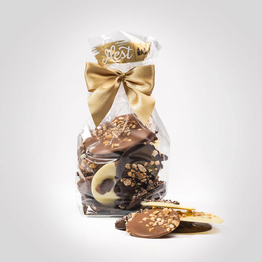 Schokotaler gemischt aus Zartbitter, Vollmilch und weißer Schokolade bestreut mit Krokant, Rosinen und gerösteten Kakaobohnenstücken
